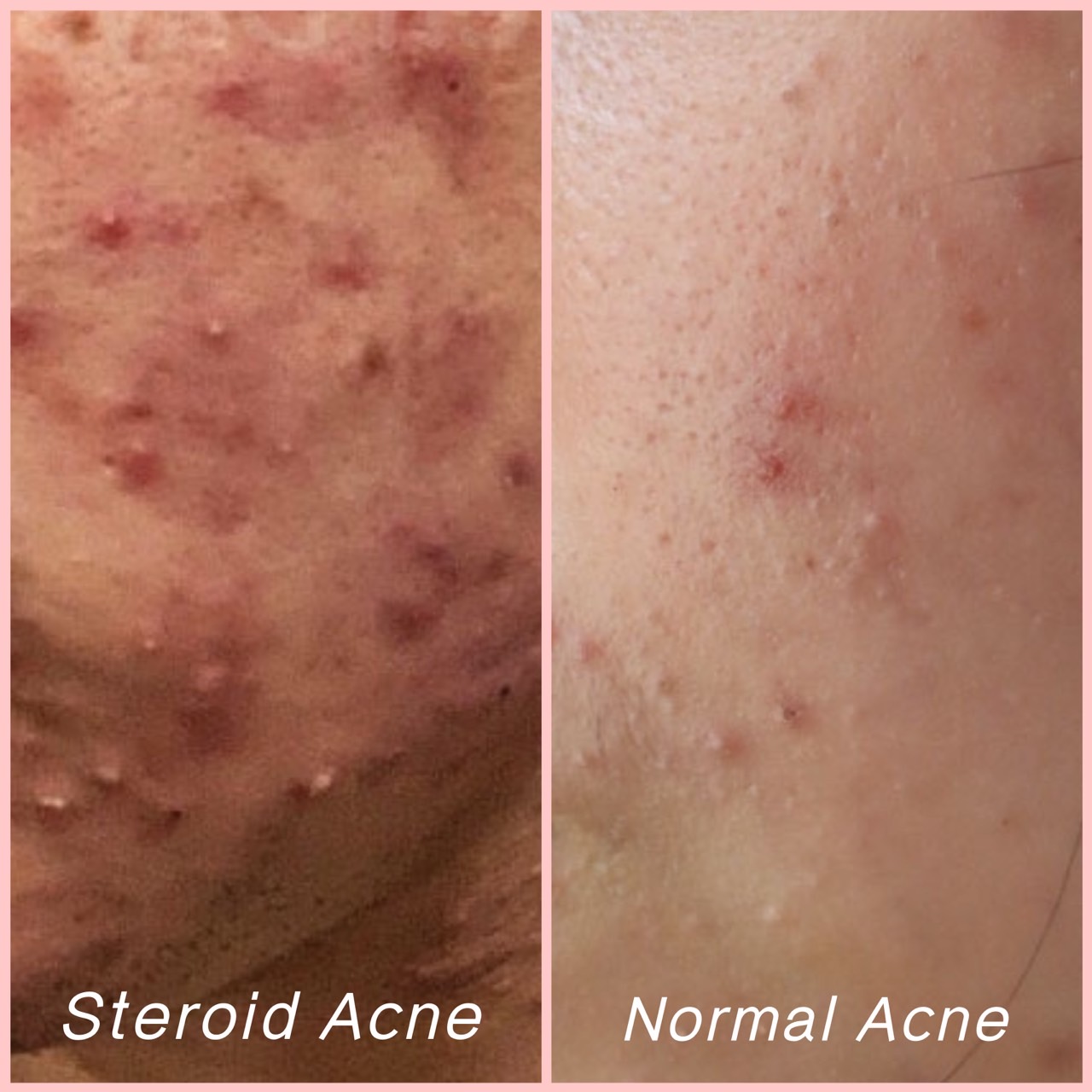 The appearance of steroid acne is characterized by a uniform lesion with red, painful pustules. This is different from general acne,we will see multiple forms of acne in the area.