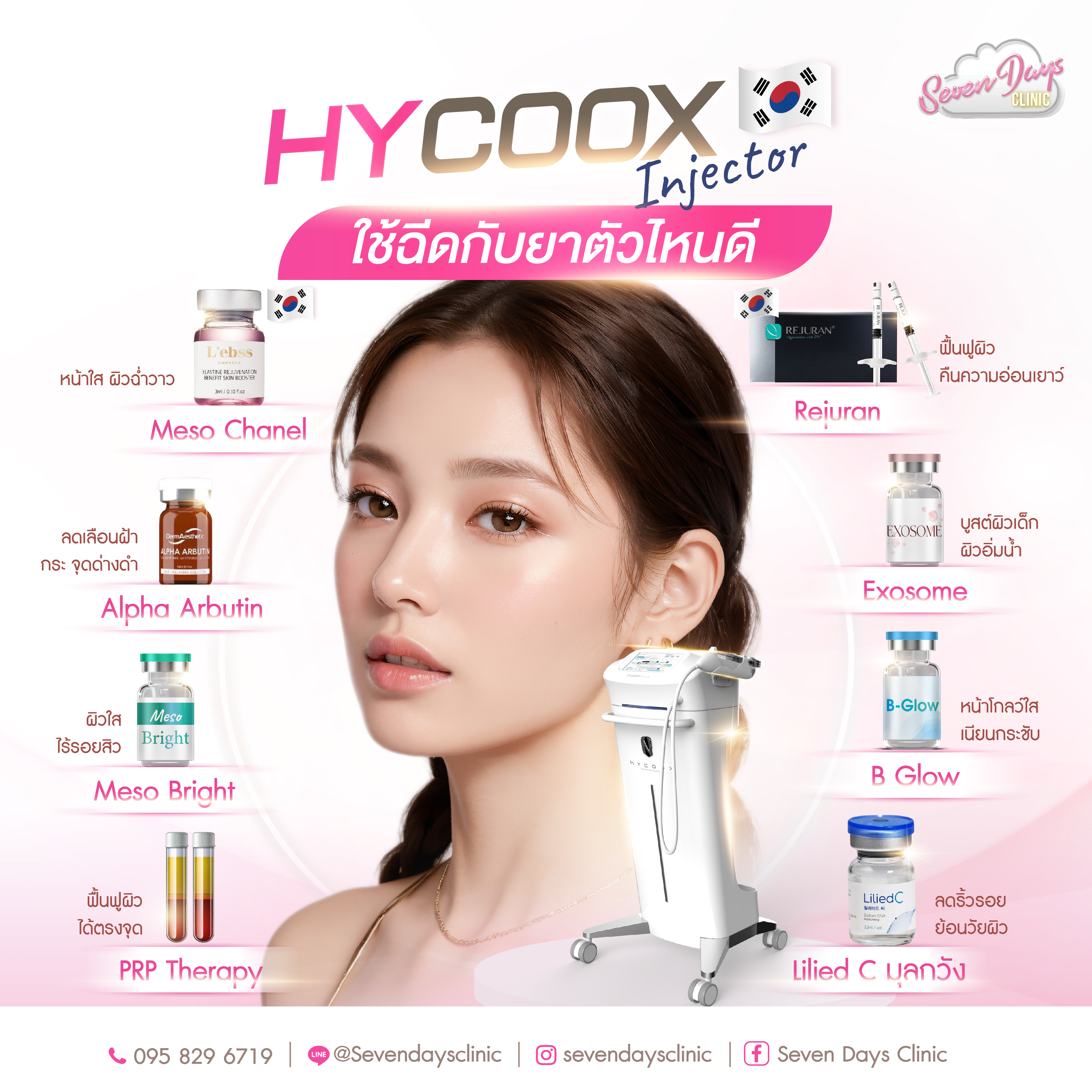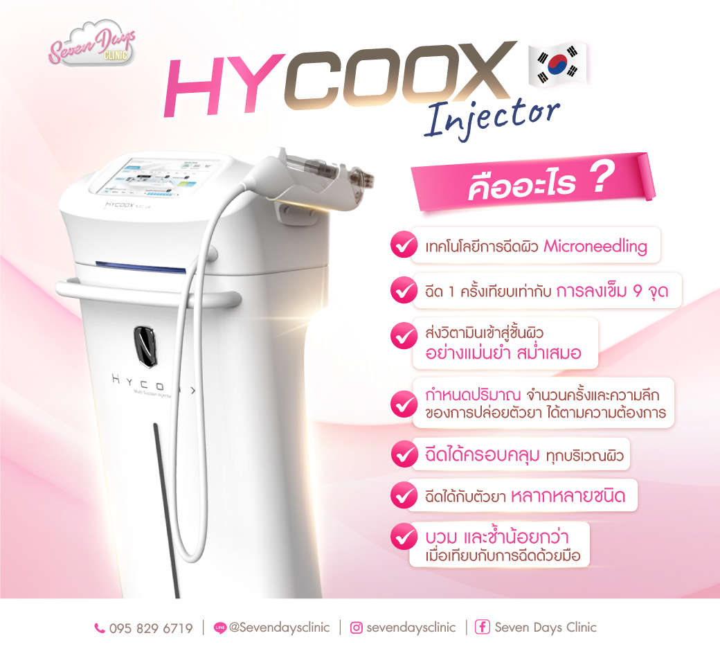 Hycoox injector เป็นที่รู้จักกันดีในนาม เครื่องฉีดวิตามินเข้าสู่ผิว แบบ microneedling เป็นเทคโนโลยีนำเข้าจากประเทศเกาหลีใต้ ที่จะช่วยทำให้การฉีดผิวเป็นเรื่องง่าย รวดเร็ว ประหยัดเวลา เพิ่มความแม่นยำ ในการกระจายตัวยาเข้าสู่ผิวได้อย่างทั่วถึงและสม่ำเสมอมากกว่าการฉีดมือปกติ การลงเข็มของ Hycoox 1 ครั้ง เท่ากับการลงเข็มถึง 9 จุด แถมยังฉีดได้ครอบคลุมหลายบริเวณของใบหน้าและหนังศีรษะ ก่อให้เกิดการบวมช้ำที่น้อยกว่าการฉีดมือ ทำให้ไม่ต้องใช้ระยะเวลาในการพักฟื้นนาน