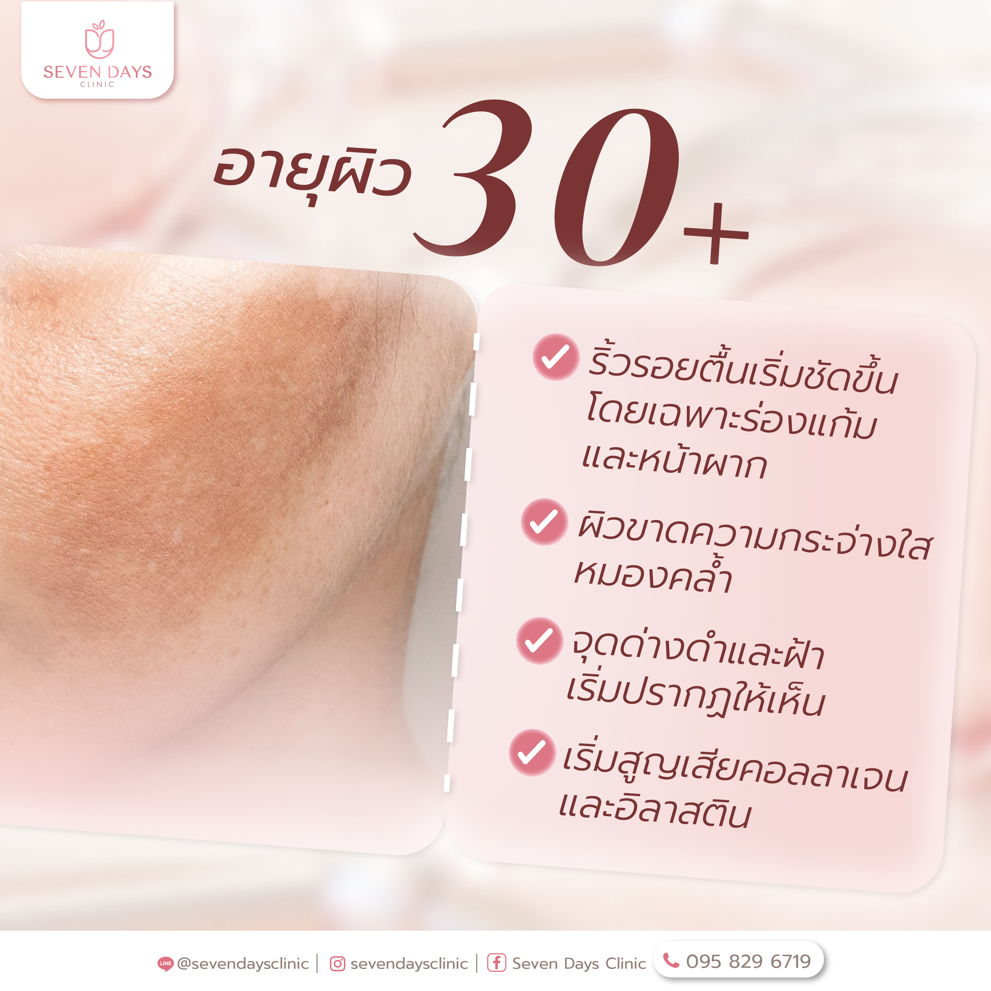 เมื่อเข้าสู่วัย 30 ปีขึ้นไป ร่างกายจะเริ่มมีการเปลี่ยนแปลงอย่างเห็นได้ชัด โดยเฉพาะเรื่องของ คอลลาเจนและอีลาสติน ที่ค่อย ๆ ลดลงตามธรรมชาติ ส่งผลให้ผิว สูญเสียความยืดหยุ่นและความกระชับ จนเริ่มเห็นความเปลี่ยนแปลงบนใบหน้า ริ้วรอยที่เคยเป็นเพียงร่องตื้นในช่วงวัย 20 ปลาย ๆ ก็เริ่ม ลึกขึ้นบริเวณหน้าผาก มุมปาก และร่องแก้ม ขณะเดียวกัน ผิวก็เริ่ม หมองคล้ำ ขาดความกระจ่างใส และอาจมี ฝ้า กระ หรือจุดด่างดำ ปรากฏขึ้นจากการสะสมของแสงแดดและมลภาวะที่ผิวเผชิญมาในช่วงวัยก่อนหน้า