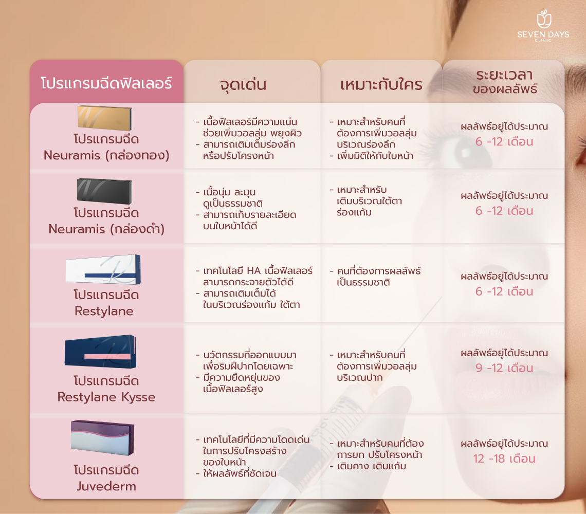สำหรับโปรแกรมฉีดฟิลเลอร์ ที่ Seven Days Clinic เลือกใช้ดังต่อไปนี้