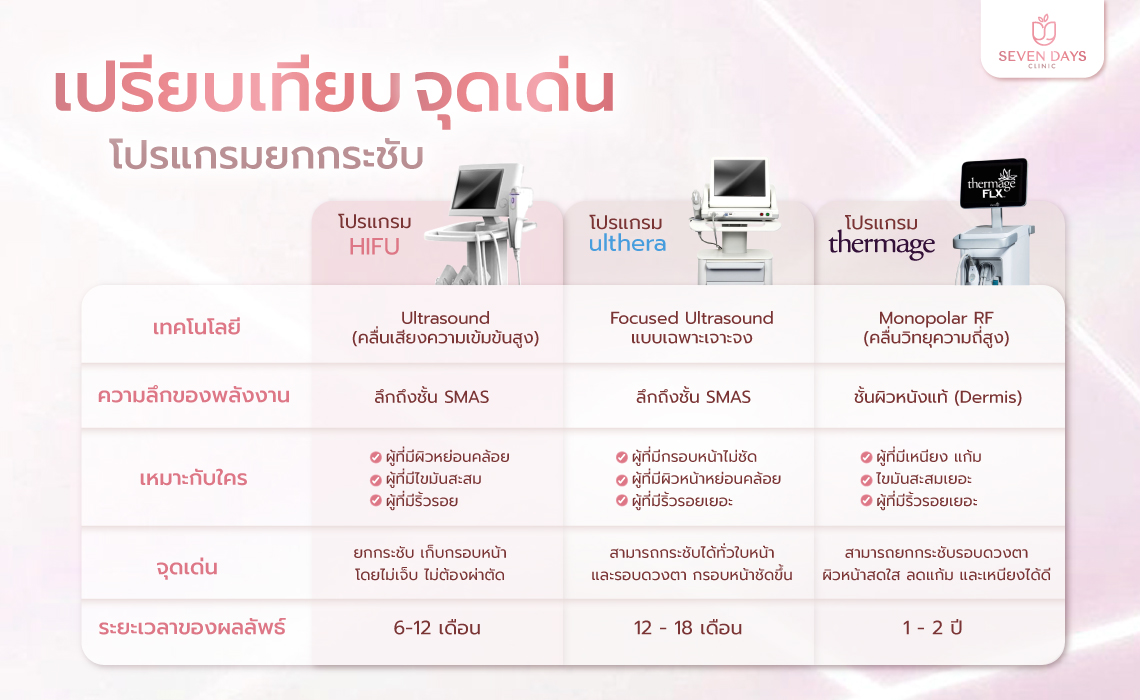 เปรียบเทียบโปรแกรมยกกระชับ จุดเด่น HIFU / Ulthera / Thermage ต่างกันยังไง?
